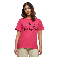 Fuksjowa modna koszulka damska z nadrukiem Faith Hope Love