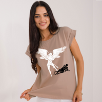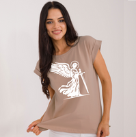 Beżowa koszulka damska z nadrukiem Krzyż z napisem Crux Sacra Sit Mihi Lux (Krzyż Święty będzie mi światłem - egzorcyzm)