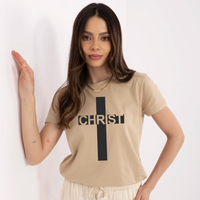 Beżowa koszulka damska z nadrukiem Christ w Krzyżu