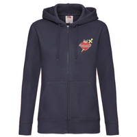 Modna Granatowa Bluza Damska Rozpinana z Kapturem – pełen haft Niepokalane Serce Maryi (biały obrys)
