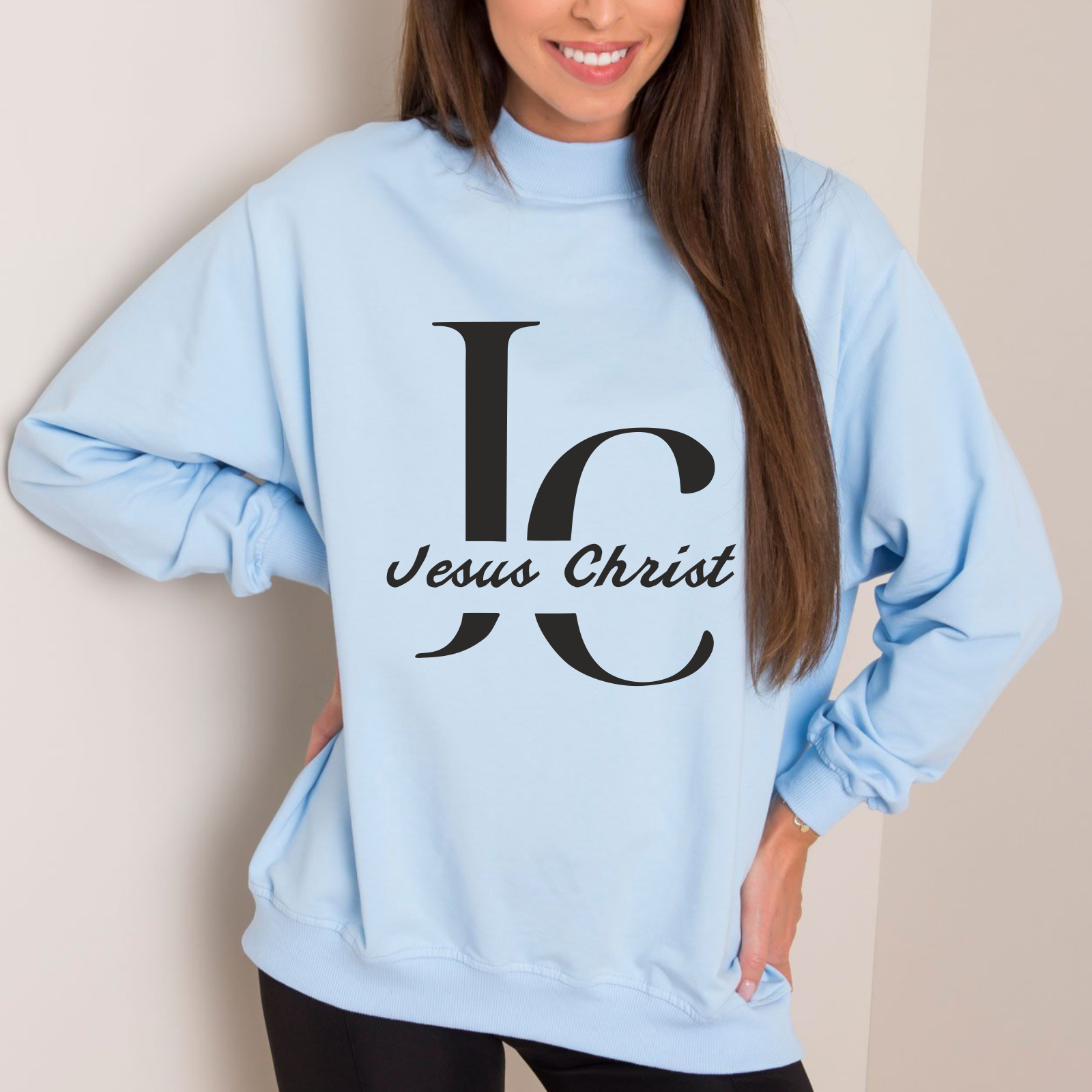 Błękitna bluza damska oversize z czarnym nadrukiem JC Jesus Christ