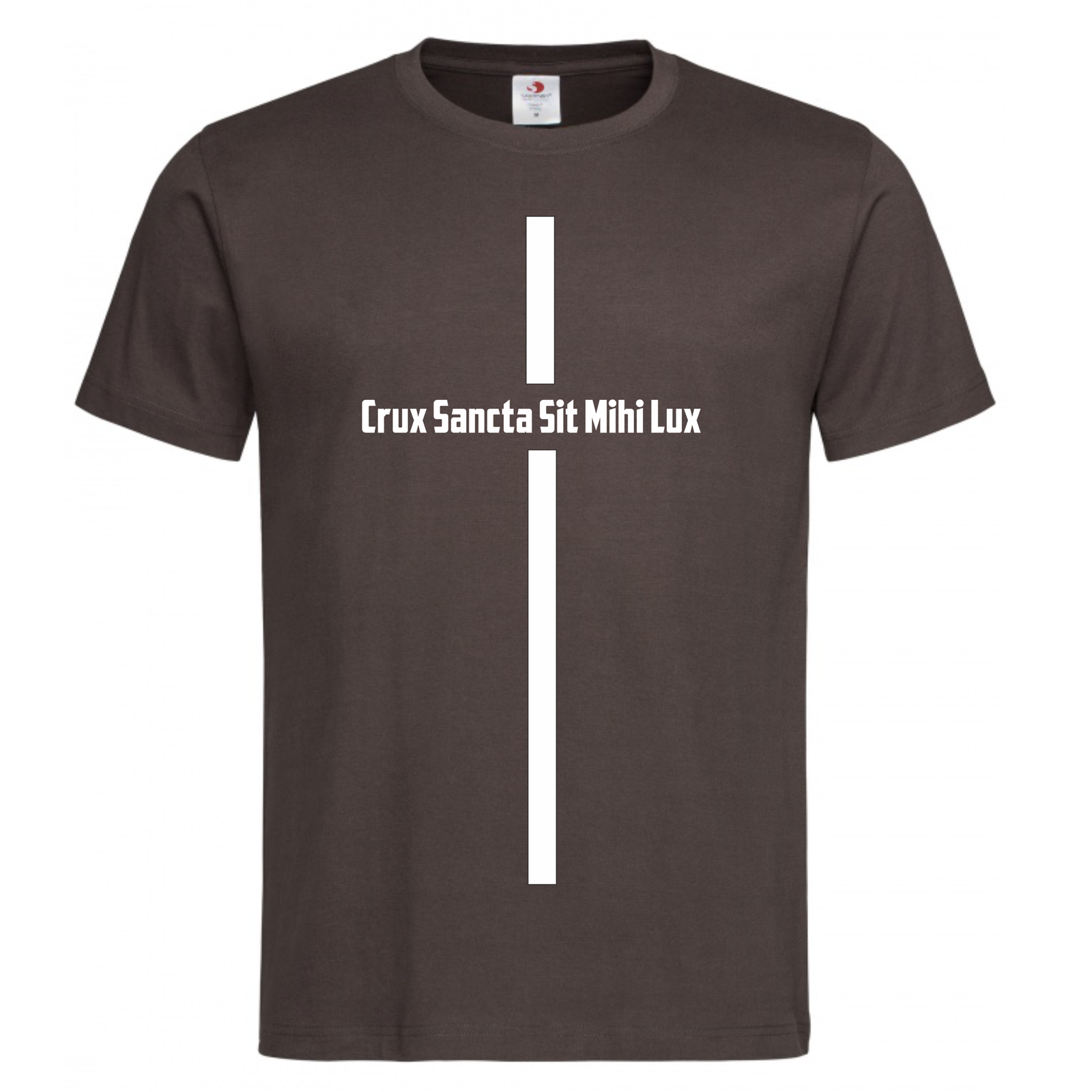 Brązowa koszulka męska z nadrukiem  Crux Sacra Sit Mihi Lux  (kolor przesłania biały)