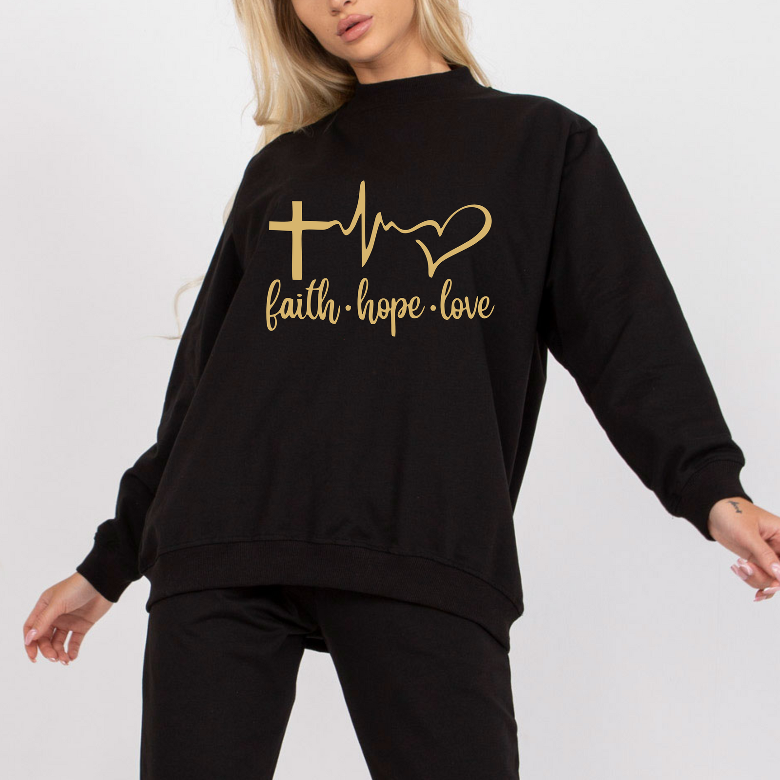 Czarna bluza damska oversize z nadrukiem faith, hope, love (wiara, nadzieja, miłość)-złoty połysk