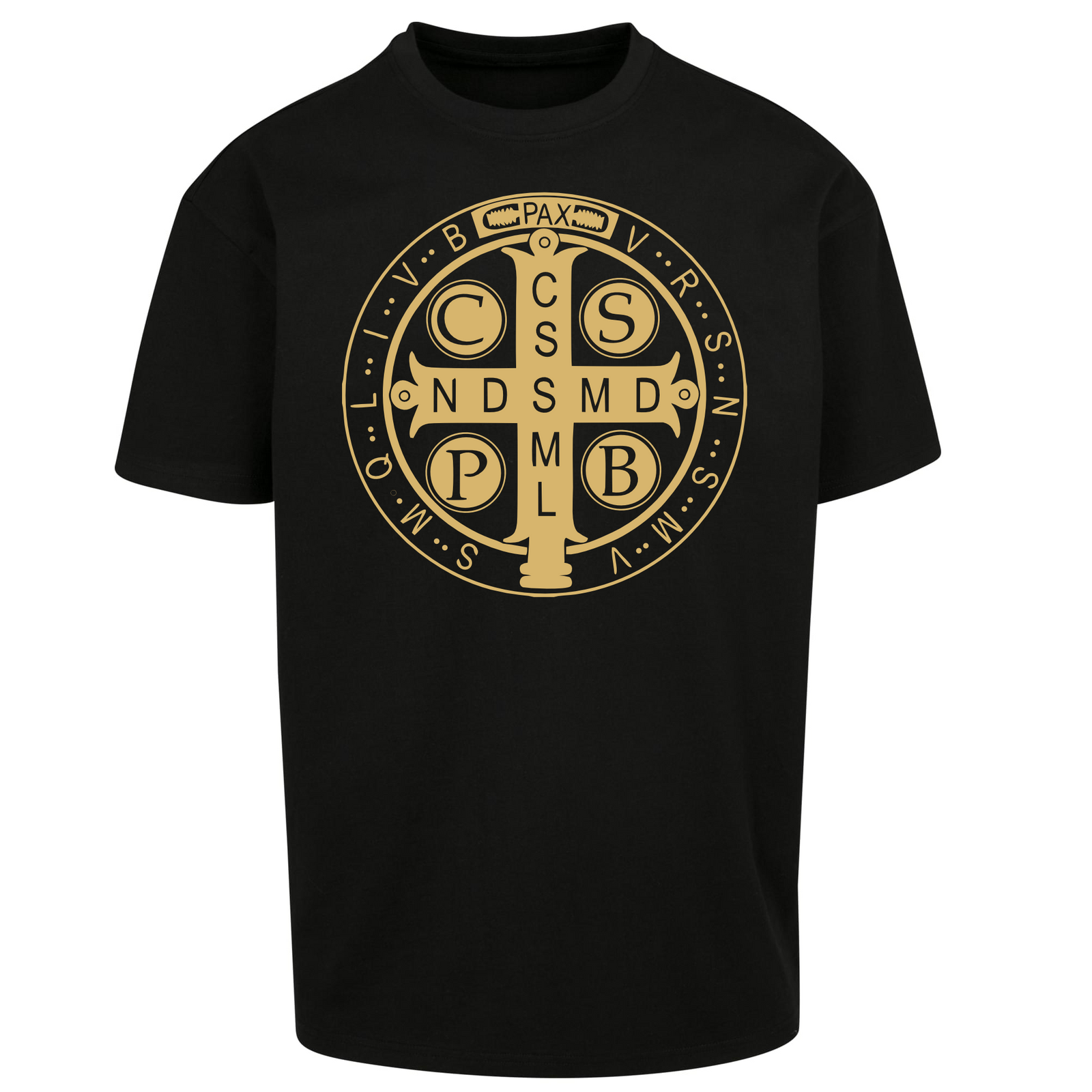 Czarna koszulka męska ze złotym nadrukiem Medalik Świętego Benedykta