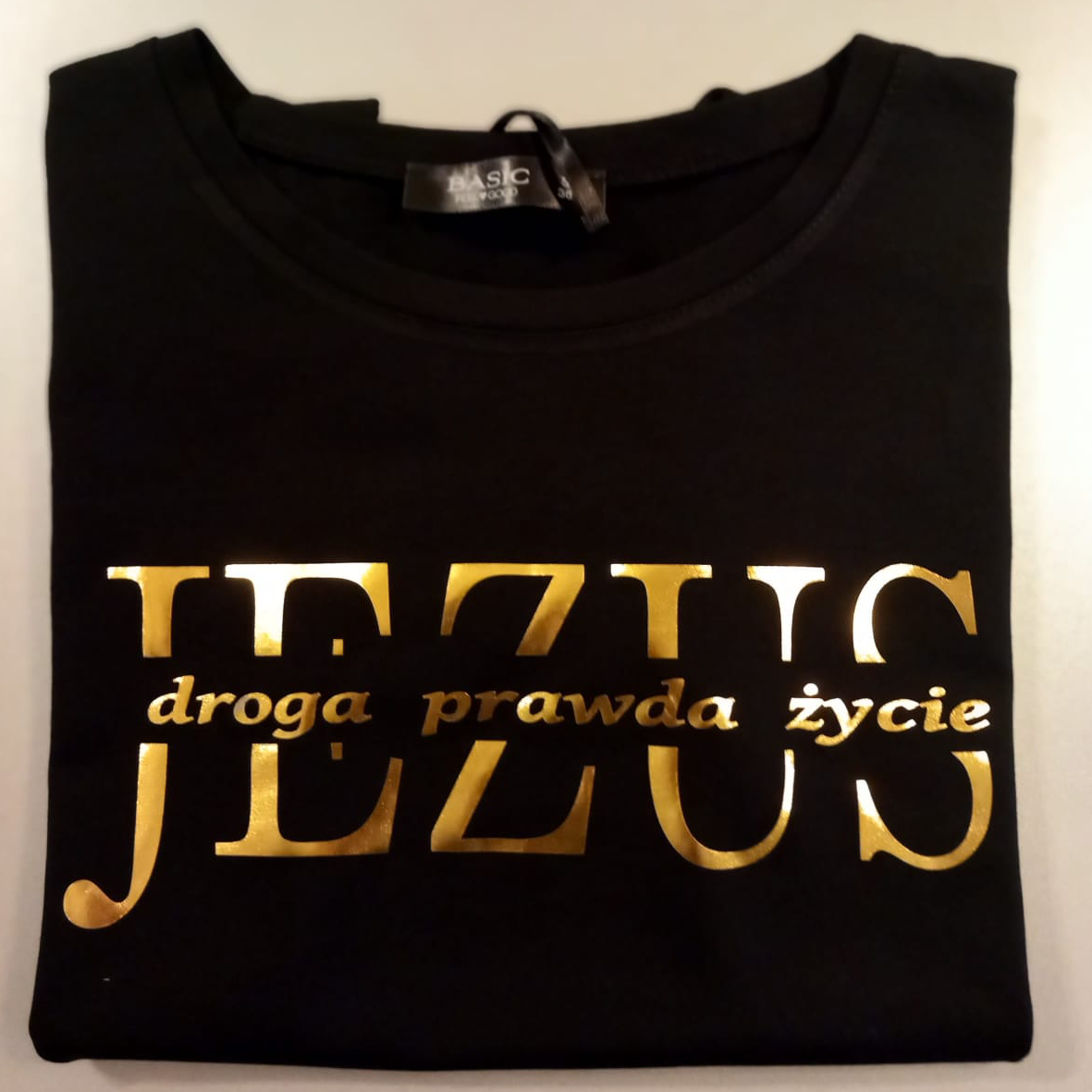 Elegancka czarna koszulka damska Jezus Droga Prawda Życie-złoty połysk