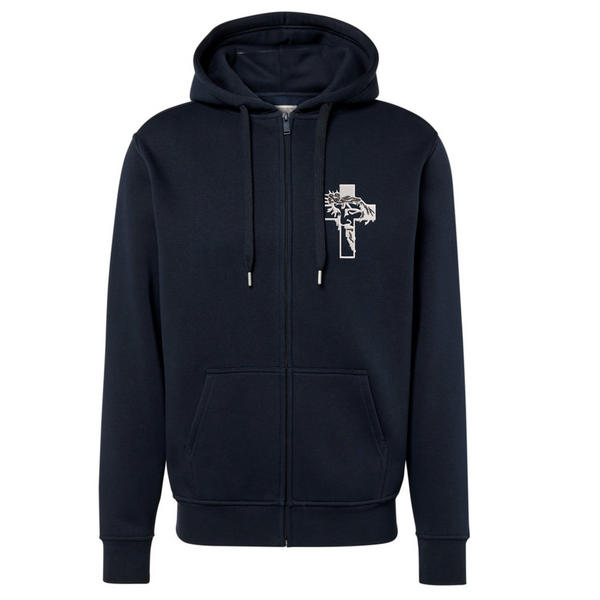 Granatowa bluza męska rozpinana z kapturem Krzyż z Twarzą Chrystusa