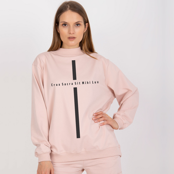 Jasnoróżowa bluza damska oversize z nadrukiem Krzyż z mottem z medalika św. Benedykta - Krzyż Święty będzie mi światłem