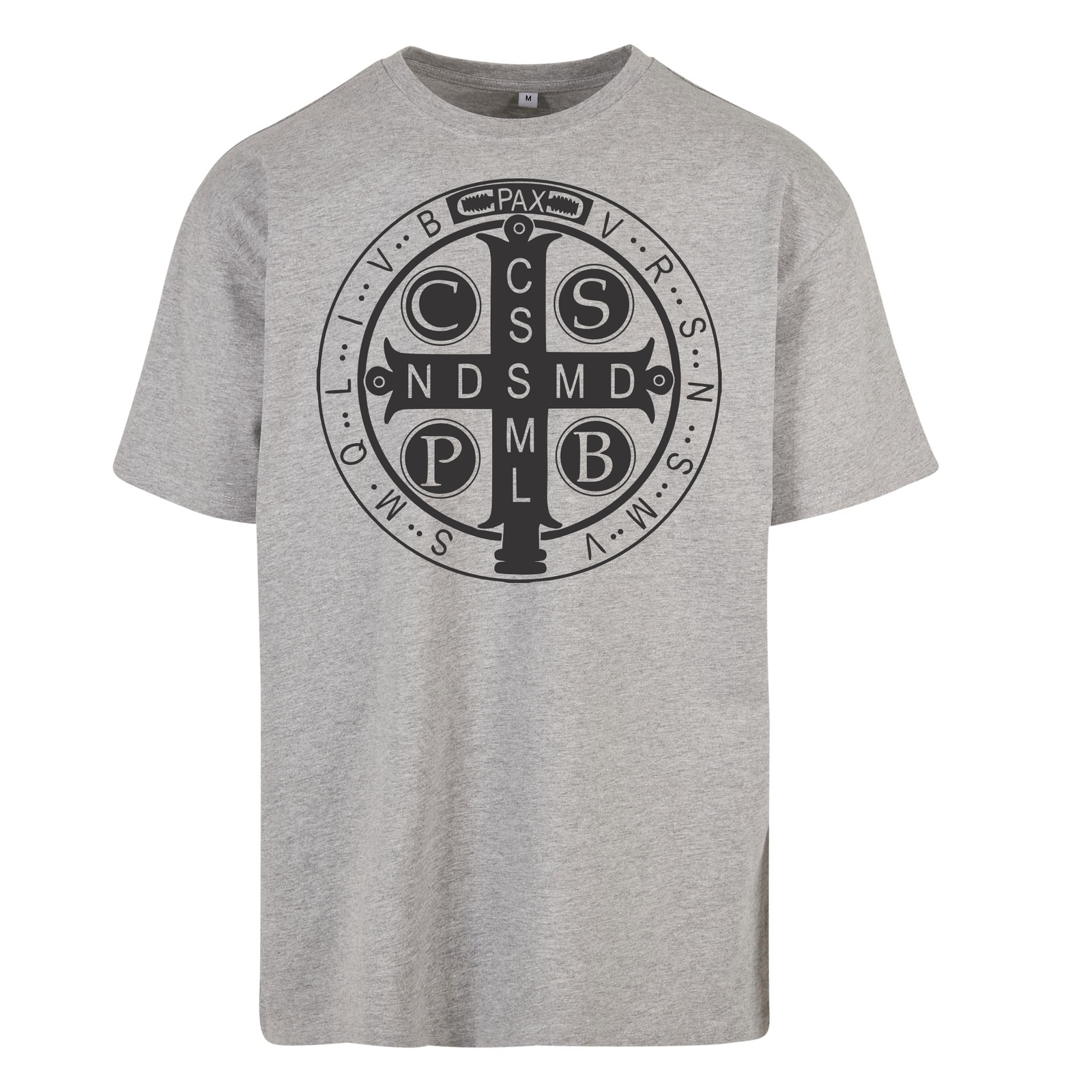 Szara koszulka męska z nadrukiem Medalik Świętego Benedykta